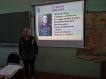 1 декабря прошел открытый классный час, посвященный 125 годовщине со дня рождения Георгия Константиновича Жукова. Подготовлен и проведен классный час, преподавателем истории Сережкиной Ниной Борисовной. Была представлена вниманию студентов мультимедийная презентация с биографическими данными и фотографиями Георгия Константиновича, продемонстрирован документальный фильм о параде Победы 1945 г. Волощук Ольга и Лукиных Ольга прочитали стихи о Маршале Победы.
