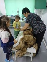 Дети прослушали лекцию про профессию ветеринара, посмотрели и потрогали рабочий инвентарь, а также сами попробовали себя в роли ветеринара и забинтовали больную ногу "Джерри".