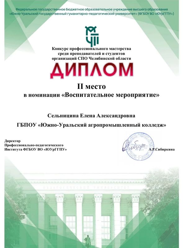 2 место в номинации "Воспитательное мероприятие" Сельницина Е. А.